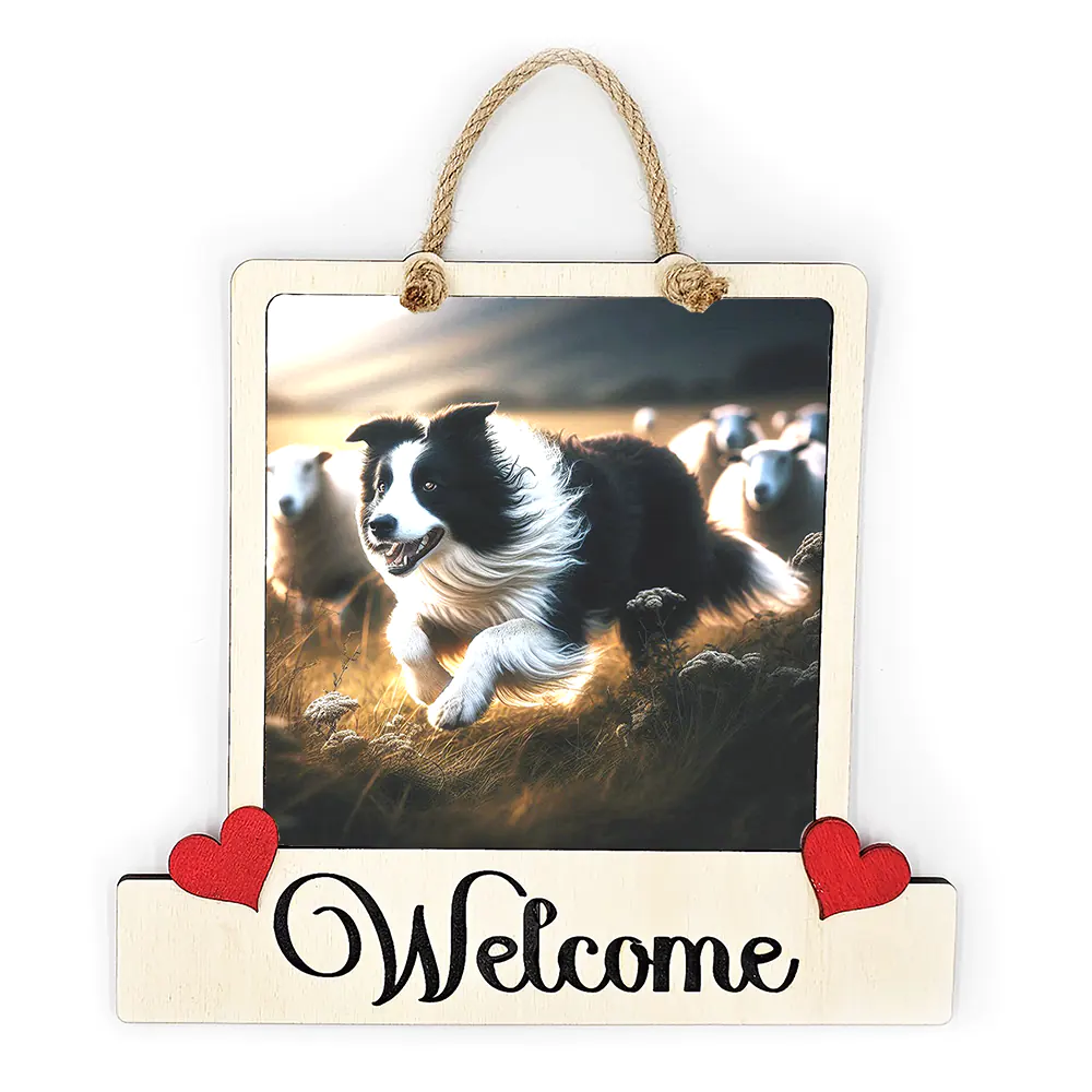 A handmade plaque that features a Colour Image of a Working Border Collie running and rounding up Sheep. Greet your guests with this stunning welcome plaque that is certain to add a touch of country class to any porch, entrance, hallway or lounge. This plaque would also look amazing in a Guest House, BnB, AirBnB, Holiday Home, Holiday Let or Caravan / Campervan.