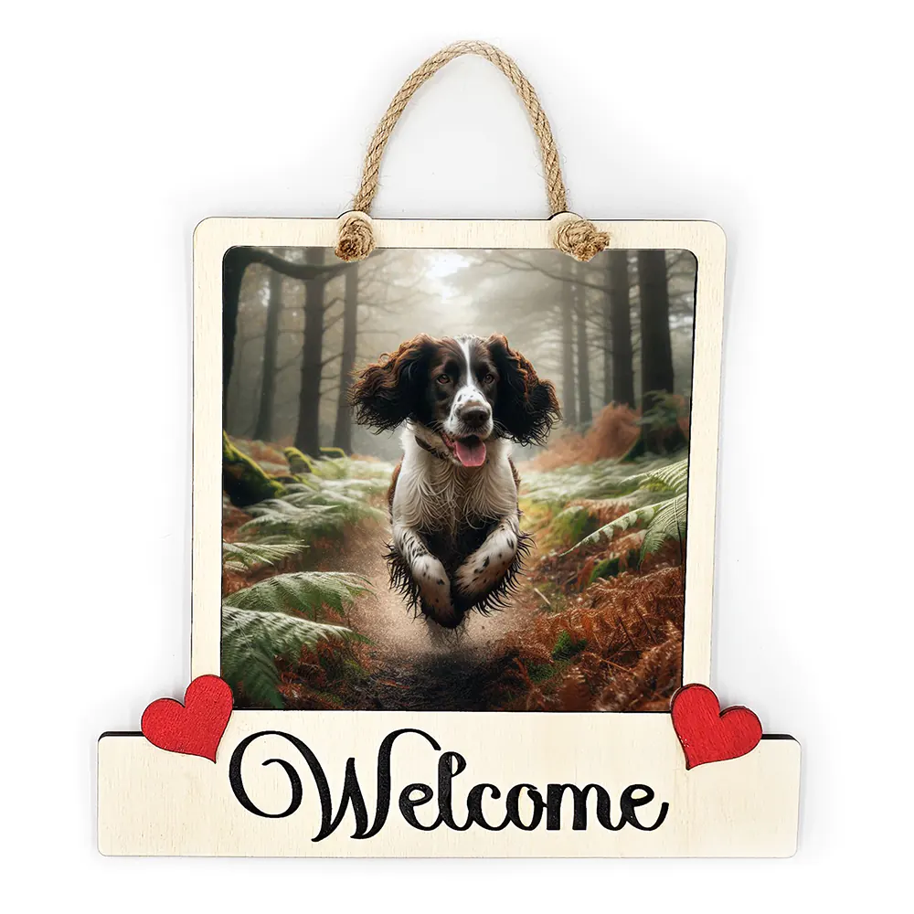 A handmade plaque that features a Colour Image of a Cocker / Springer Spaniel running through a woodland. Greet your guests with this stunning welcome plaque that is certain to add a touch of country class to any porch, entrance, hallway or lounge. This plaque would also look amazing in a Guest House, BnB, AirBnB, Holiday Home, Holiday Let or Caravan / Campervan.