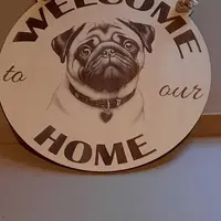 A handmade plaque that features a Pug picture and the message "Welcome to our Home", greet your guests with a warm and cheery message that is inviting and welcoming. Perfect for in the porch and also would look great in a holiday let or airBnb rental.