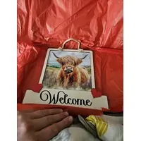 A handmade plaque that features a Colour Image of a Highland Cow. Greet your guests with this stunning welcome plaque that is certain to add a touch of country class to any porch, entrance, hallway or lounge. This plaque would also look amazing in a Guest House, BnB, AirBnB, Holiday Home, Holiday Let or Caravan / Campervan.